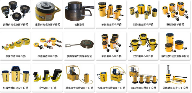 飛耀液壓千斤頂型號有幾十種,有本體高度很低的FY-RCS薄型、FY-RSM超薄型、FY-STC超低薄型、FY-UTC超高壓超低薄型。有用途廣泛的FY-RC單作用、FY-RR雙作用。有承載能力很大的FY-CLSG單作用大噸位、FY-CLRG雙作用大噸位。有活塞桿是中空的FY-RCH單作用中空型、FY-RRH雙作用中空型。有活塞桿帶螺紋的FY-CLP薄型螺母鎖定液壓千斤頂、FY-CLL機(jī)械式螺母鎖定千斤頂。以及鋁合金材質(zhì)的FY-RAC鋁制單作用千斤頂、FY-RAR鋁制雙作用千斤頂、FY-RACH鋁制中空千斤頂。另還有連體頂、機(jī)械頂、車載式頂?shù)鹊龋@里就不一一介紹。